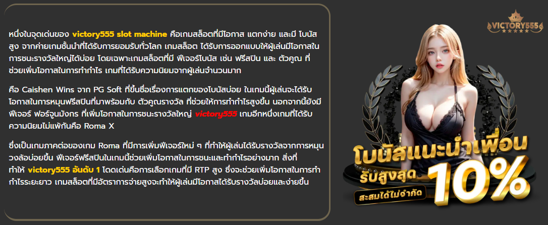 เว็บไซต์ VICTORY555 นี้เปิดให้บริการเกมสล็อตออนไลน์ที่หลากหลาย จากค่ายเกมชั้นนำที่ได้รับการยอมรับจากผู้เล่นทั่วโลก ด้วยระบบที่ใช้งานง่ายและเกมที่หลากหลาย ทั้งเกมสล็อตคลาสสิกที่มีความเรียบง่ายและเกมวิดีโอสล็อตที่เต็มไปด้วยฟีเจอร์ใหม่ ๆ จุดเด่นของ สล็อต victory555 คือระบบการให้บริการที่เสถียรและการเข้าเล่นที่สะดวก สามารถเล่นได้ทั้งบนคอมพิวเตอร์และอุปกรณ์มือถือ ไม่จำเป็นต้องติดตั้งแอปพลิเคชันก็สามารถเข้าเล่นได้ทันทีจากเบราว์เซอร์ทุกประเภท นอกจากนี้ยังมีการรองรับการฝากและถอนเงินที่รวดเร็ว ผ่านระบบอัตโนมัติ ทำให้ผู้เล่นสามารถทำธุรกรรมได้ง่ายและสะดวก